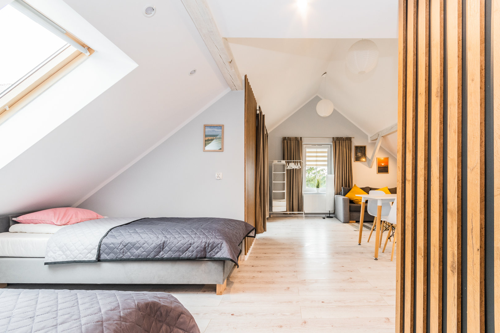 Apartament nr 3 ma powierzchnię 50 m2 + taras 10 m2. Znajduję się on na drugim piętrze budynku, został zaadoptowany z niegdysiejszego poddasza, przez co jest jest on najbardziej „klimatyczny” ze wszystkich naszych apartamentów. Pozostawienie na wierzchu starych belek konstrukcyjnych oraz zaaranżowanie tarasu „wciętego” w dach dodatkowo dodaje uroku i przytulności.
